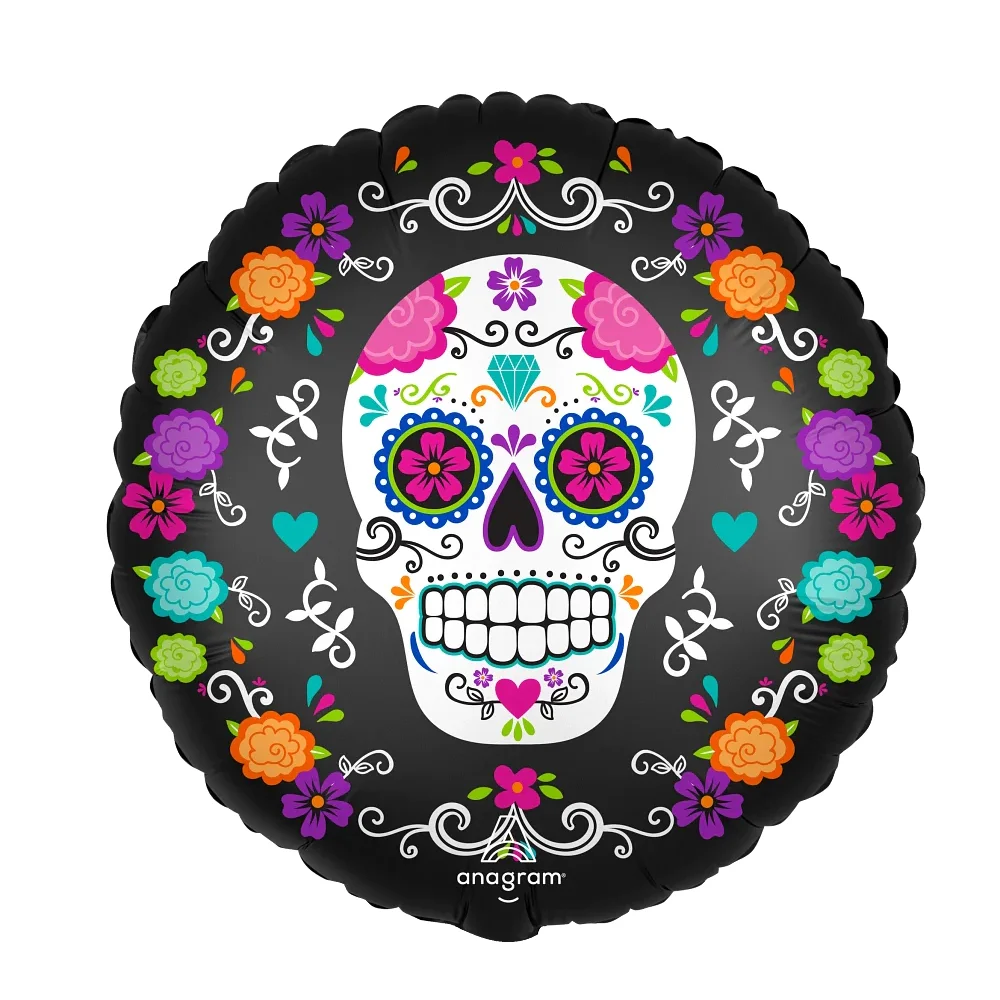 18″ Satin Sugar Skull and Colored Marigolds Balloon