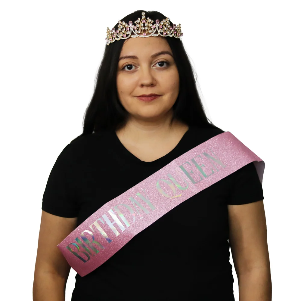 Pink Glittered Iridescent “Birthday Queen Sash & Tiara